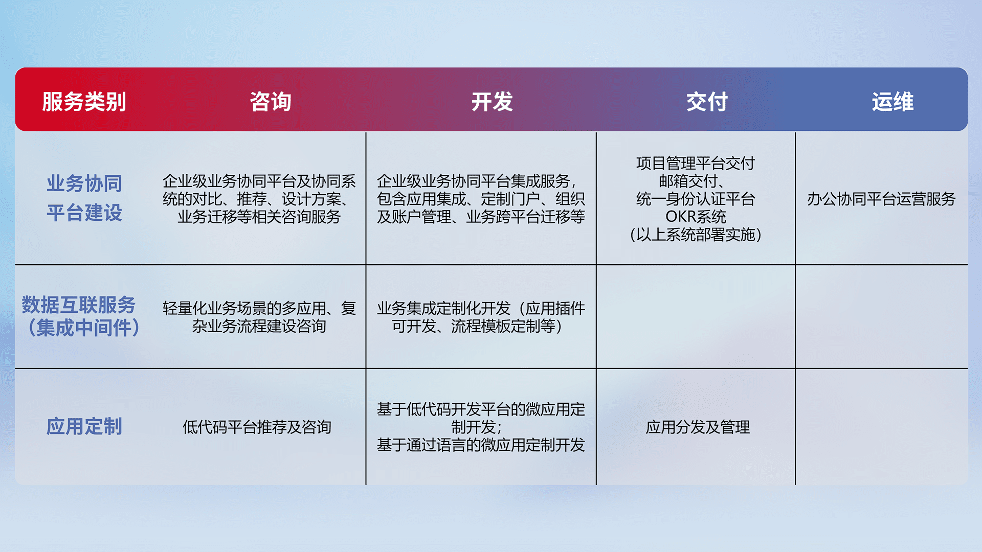 针对钉钉、、企微、、IDaas等平台级产品提供产品的规划、、方案、、交付、、定制化开发等服务,,实现如统一协同办公、、、、智能客户服务、、、、混合会议管理、、、智能数据查询、、、、等业务场景,,,,实现数字化转型。。。。