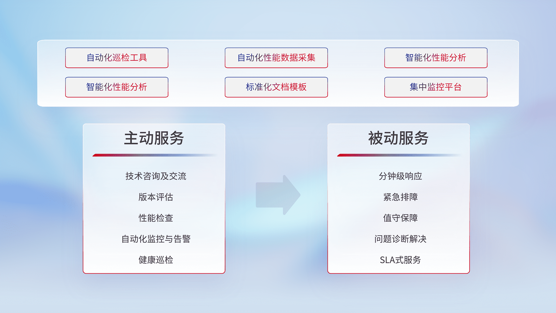 智能化工具和标准化文档,,保障服务质量,,,提供主动服务(包含技术咨询、、版本评估、、性能检查、、自动化监控与告警、、、健康巡检)和被动服务包含(分钟级响应、、、紧急排障、、、、值守保障、、问题诊断解决、、、、SLA服务)。。。