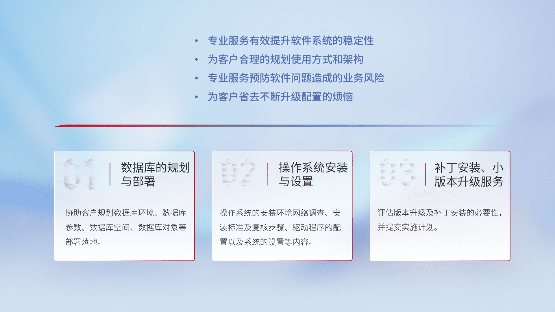 为客户提供软件规模升级、、快速部署、、、按需配置的专业服务,,从数据库的规划与部署到操作系统的安装与设置,,再到补丁安装和小版本升级提供支持。。