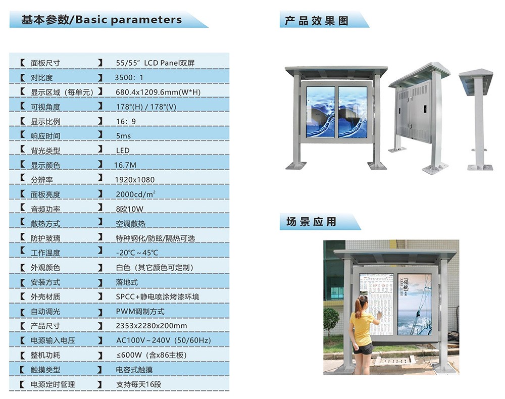 采用专业LED背光,,LCD屏幕流明可达到1500/2000/3000nits(约是常规产品亮度的3/5/8倍)以上,,,,可以在户外强光环境下清晰显示图像自动亮度调节(或手动控制),,,,根据周围环境自动调节屏幕亮度使屏幕图像达到最佳的可视效果,,,,同时也达到了节能及产品极低的老化度。。。。