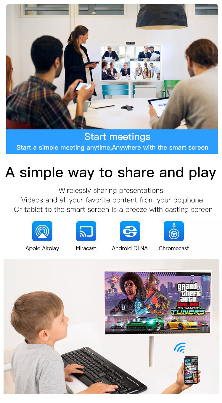 Connectivity: Have a wireless screen sharing function from a smartphones and/or laptop